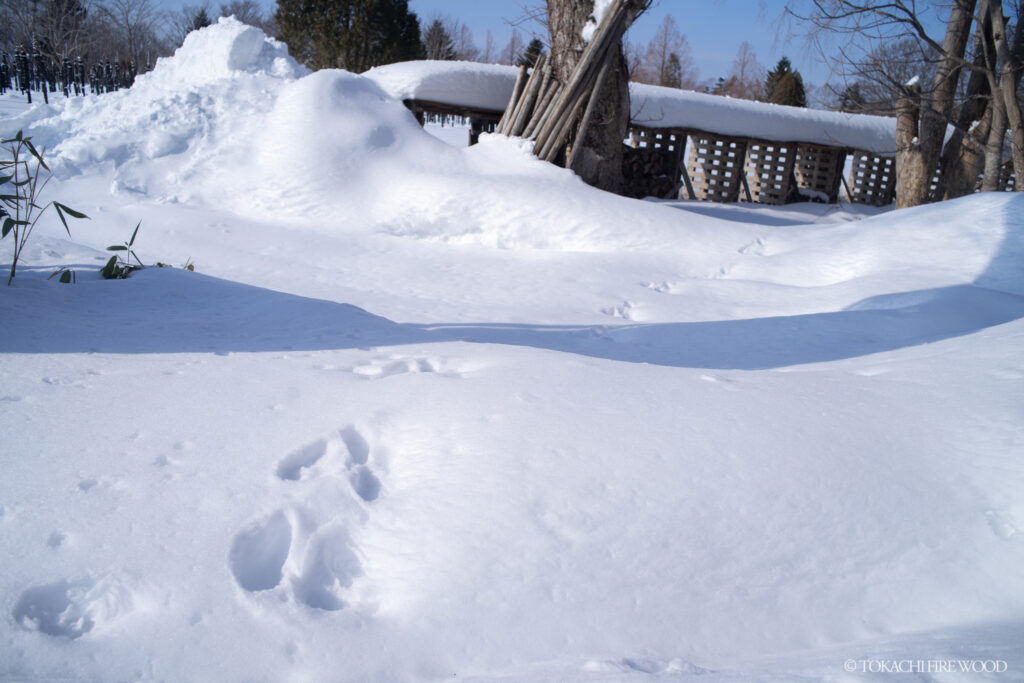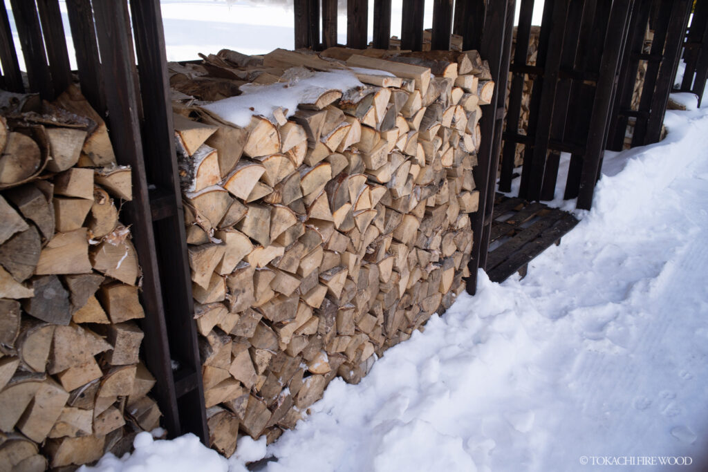 在庫の薪は屋根付きの薪棚に並べられ、雪の下でも乾燥薪の品質は変わりません。